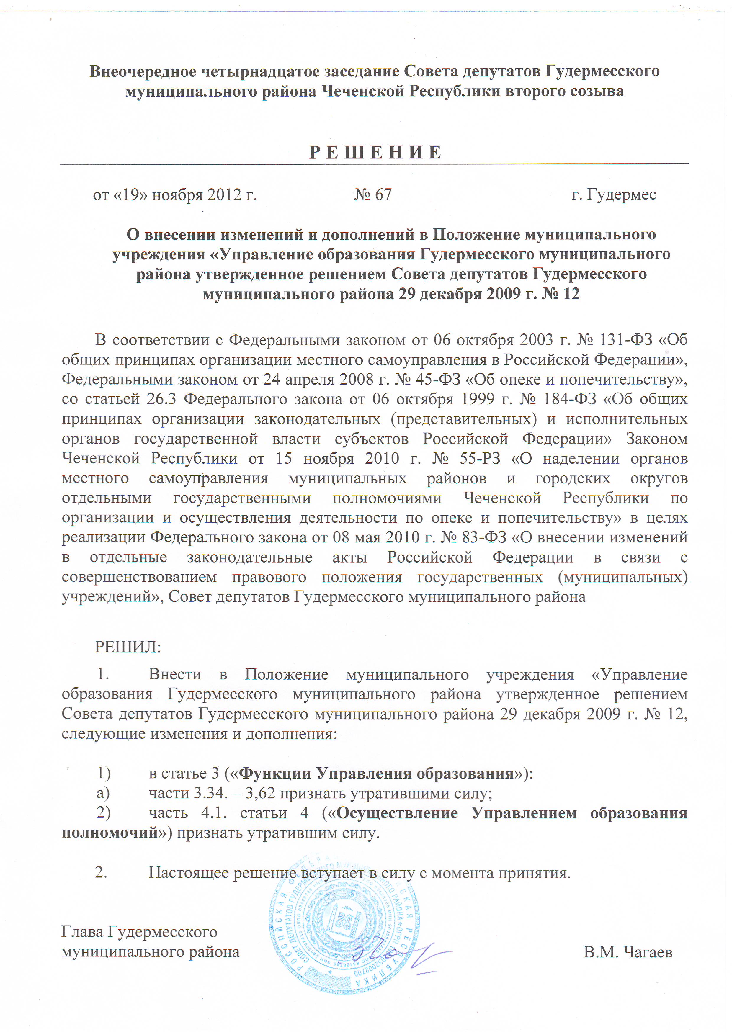 Порядок утверждения уставов муниципальных бюджетных образовательных учреждений Гудермесского муниципального района и внесения изменений в них за №209 от 05.11.2021г.