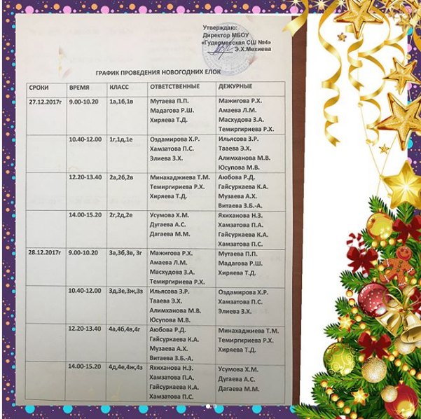 График проведения новогодних ёлок в МБОУ "Гудермесская СШ №4"