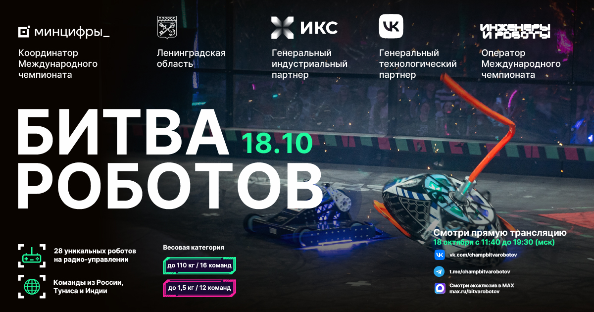 13.10.2025БИТВА РОБОТОВ — МЕЖДУНАРОДНЫЙ ЧЕМПИОНАТ, ГДЕ РОБОТЫ СРАЖАЮТСЯ В ЗАХВАТЫВАЮЩИХ ПОЕДИНКАХ. Это место, где креативность встречается с технологиями, а мечты о будущем становятся реальностью. Машинами управляют команды разработчиков — опытные инженеры и молодые специалисты из разных стран. Чемпионат объединяет инженеров разных направлений, давая им шанс проявить себя в мире робототехники.