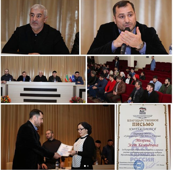 03.04.2018Сегодня директор МБОУ " Гудермесская СШ4" Мехиева Э.Х. вместе с Главой Администрации Гудермесского муниципального района Оздамировым У.А. и руководителем Регионального исполкома Чеченского отделения партии " Единая Россия" Адланом Динаевым приняла участие в собрании представителей местного отделения партии "Единая Россия" .Адлан Динаев отметил благодарственным письмом Мехиеву Эсет Хамидовну за безупречную добросовестную работу и активное участие в избирательной кампании по выборам Президента Российской Федерации в марте 2018г. Хотели бы выразить свою благодарность за оказанное внимание Главе Администрации Гудермесского муниципального района Оздамирову У.А. и руководителю Регионального исполкома Чеченского отделения партии "Единая Россия" Адлану Динаеву.
